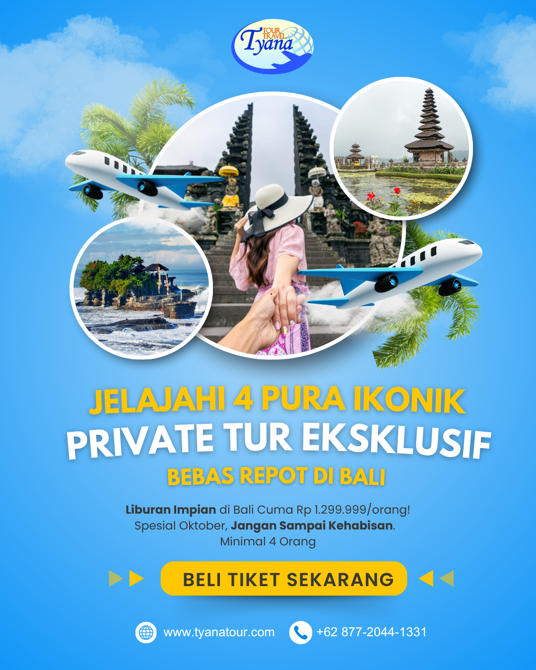 Bayangkan, kamu tidak perlu lagi pusing memikirkan transportasi, rute perjalanan, atau mencari tempat makan yang nyaman. Dengan harga Spesial Oktober mulai dari Rp 1.299.999/orang (untuk minimal 4 orang), kamu bisa menikmati semua keindahan 4 Pura Ikonik dan aktivitas seru lainnya tanpa perlu repot. Semua sudah diurus, mulai dari penjemputan, guide yang berpengalaman, hingga biaya masuk destinasi.